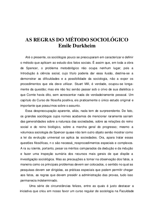View PDF. Resenha: Do Autor: Durkheim, Émile - Do livro: As Regras do Método Sociológico - Do texto: Prefácio I e II; Introdução; Capítulo I O que é Fato Social; e Conclusão - Da Tradução: Eduardo Lucio Nogueira - Da Editorial Presença - Lisboa, 2001- Da Obra de 1895. O texto ao iniciar com o prefácio á primeira edição.