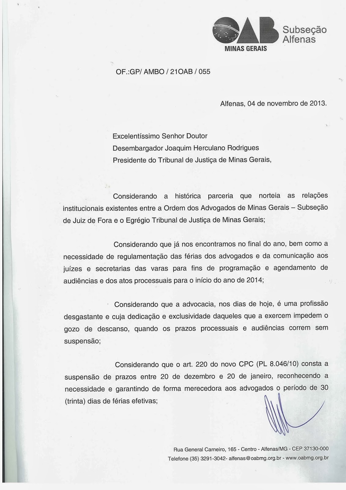 OAB Alfenas/MG Requerimento de suspensão de prazos ao TJMG