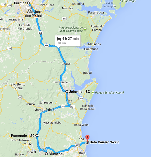 BR-324, BR-116 (Rio-Bahia), BR-381, Anel Rodoviário de Belo Horizonte, BR-381 (Fernão Dias), BR-116 (Dutra), Marginais do Tietê e Pinheiros, Ponte da Cidade Universitária, Av. Eliseu de Almeida, Largo do Taboão e BR-116 (Régis Bittencourt) Distância aérea em linha reta entre Salvador e Curitiba: 1784 km. Obs.:
