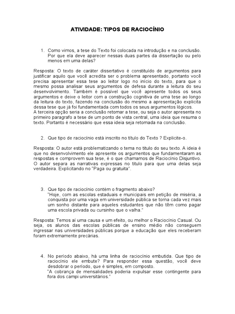 Atividade Tipos de Raciocínio PDF Argumento Lógica