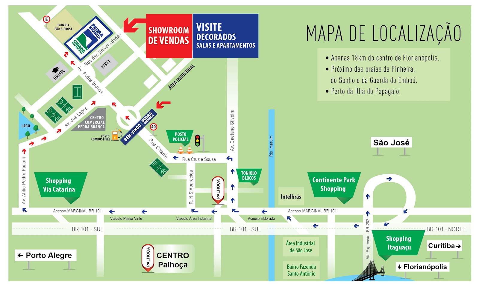 Lazer, cidades, educação e transporte. Situada em Palhoça, município localizado a cerca de 15 quilômetros de Florianópolis, a Cidade Criativa Pedra Branca fica próxima de tudo o que é fundamental para se viver bem. Tanto no bairro como em suas proximidades é possível encontrar universidades, escolas, agências bancárias, shoppings.